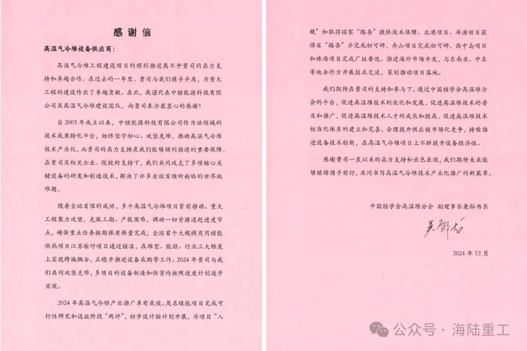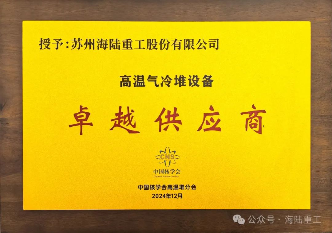 Recently, Suzhou Hailu Heavy Industry Co., Ltd. was awarded the honor of "Excellent Supplier" by the High Temperature Reactor Branch of the Chinese Nuclear Society for its outstanding performance in the field of fourth generation high-temperature gas cooled reactors for nuclear power, and received a thank-you letter. This honor is not only a full recognition of the technical strength and service level of Hailu Heavy Industry, but also a high recognition of its long-term contributions in the field of nuclear energy.